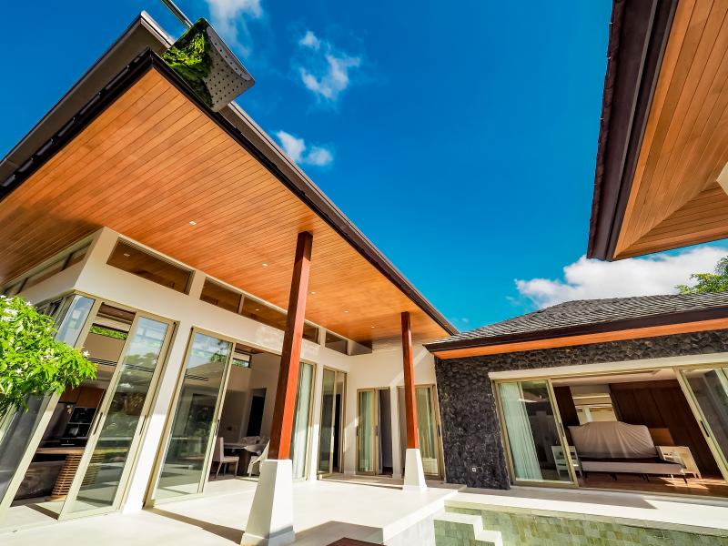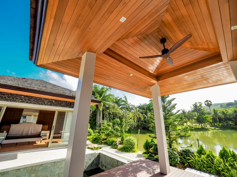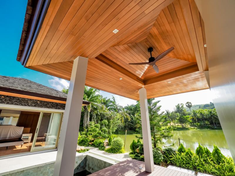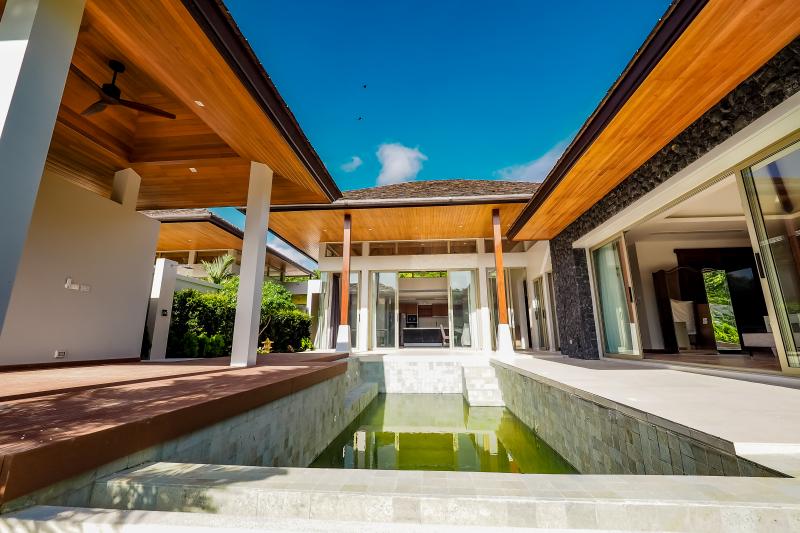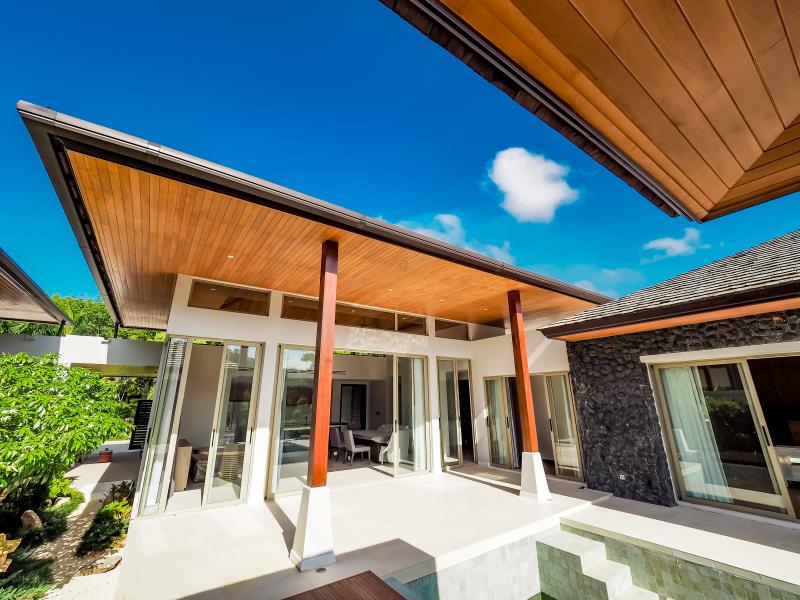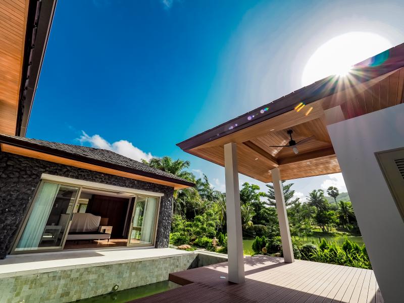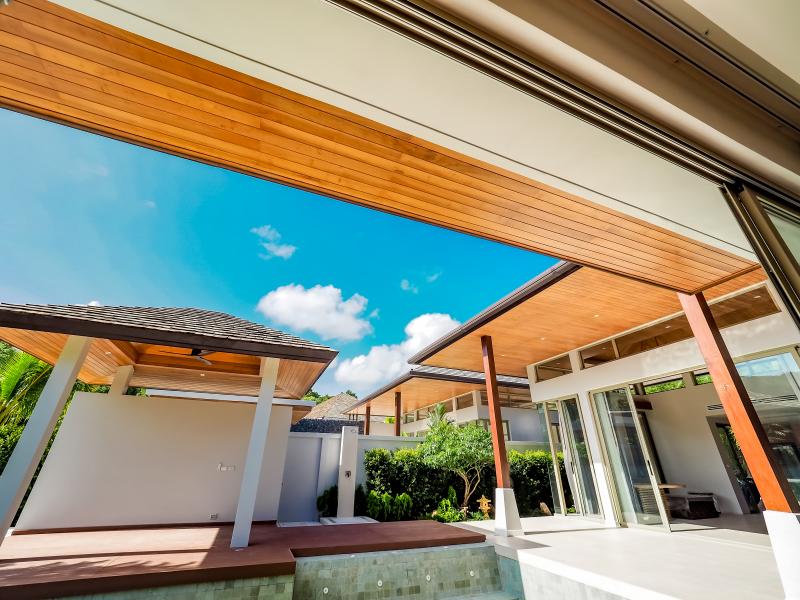 We envelops a natural stone-tiled swimming pool, which serves as the pièce de résistance to the free-flowing floor plan. The vaulted, teak wood ceilings create an elegant and authentic finish throughout the villas, while the concertina glass doors and transom windows above the doors add light and radiance to the main area of the home.